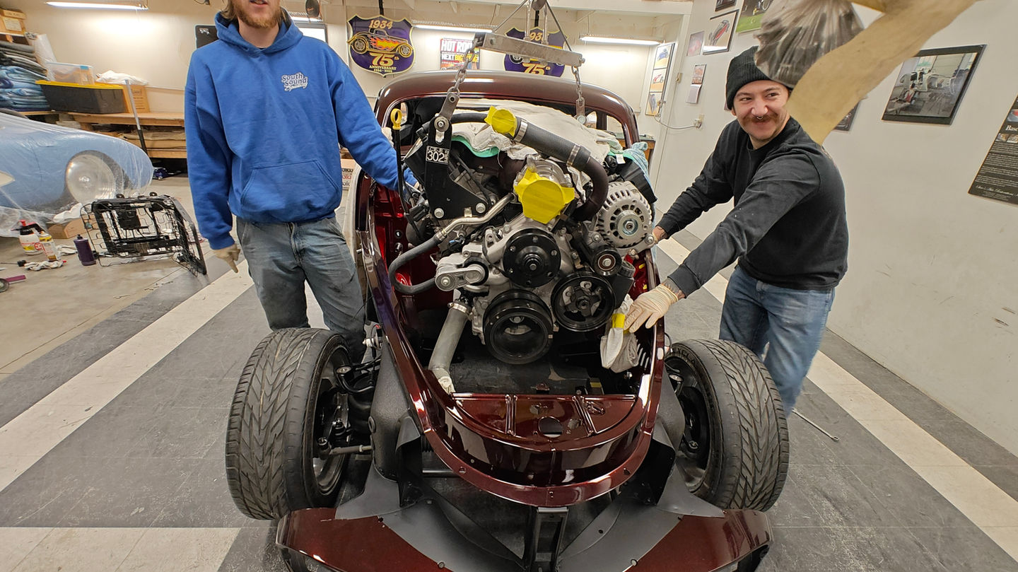 Assembly continues with brakes, sound deadening, wiring. Engine installed.