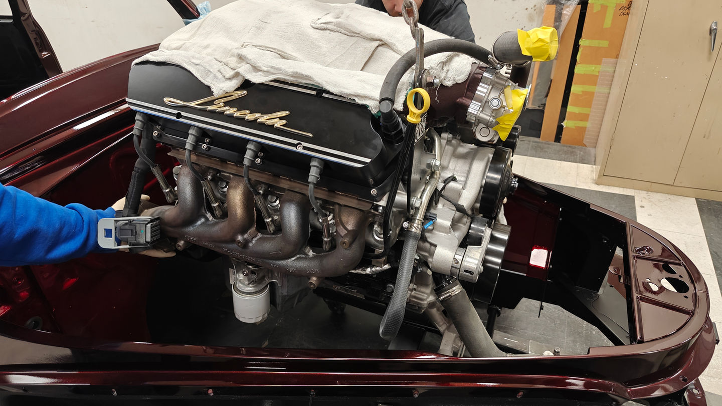 Assembly continues in the engine bay. Body cut and buff continues the paint finishing process.